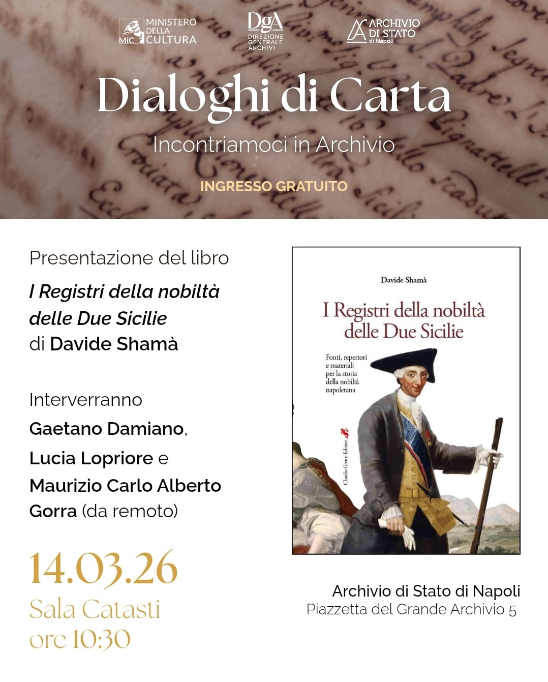 Presentazione del volume "I Registri della nobiltà delle Due Sicilie" di Davide Shamà, il 14 marzo 2026 presso l'Archivio di Stato di Napoli
